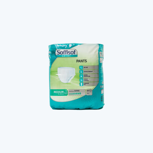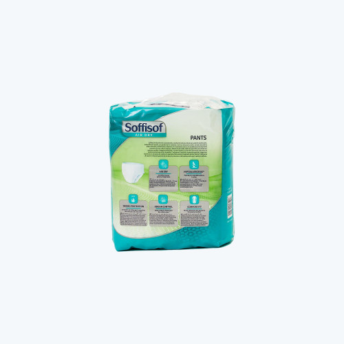 "Soffisof Air Dry Pants è una mutandina assorbente monouso ideale per pazienti deambulanti, autosufficienti e attivi, con perdite lievi e moderate. Facile da indossare come la normale biancheria intima. Discreta, confortevole e silenziosa. Il rivestimento esterno in morbido tessuto traspirante permette alla tua pelle di respirare. Dotata di una banda elastica ergonomica per ottenere il massimo comfort e maggiore vestibilità. I morbidi elastici e le barriere girocoscia assicurano la massima protezione contro le perdite. L’indicatore di umidità a scomparsa graduale suggerisce facilmente il momento del cambio."